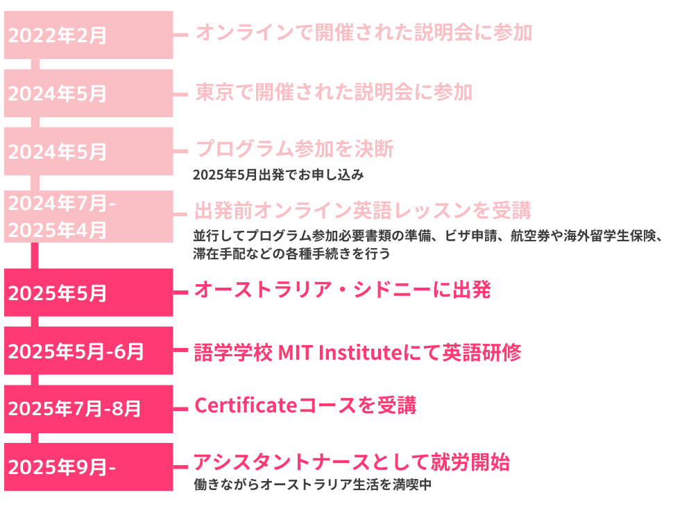 Akariさんが参加したアシスタントナース有給インターンシップは、オーストラリアのワーキングホリデー制度を利用した看護師限定の留学プログラムです。勉強も仕事も旅行も、自由にアレンジできるからこそ、皆さん次第でどんな経験にも挑戦いただけます。